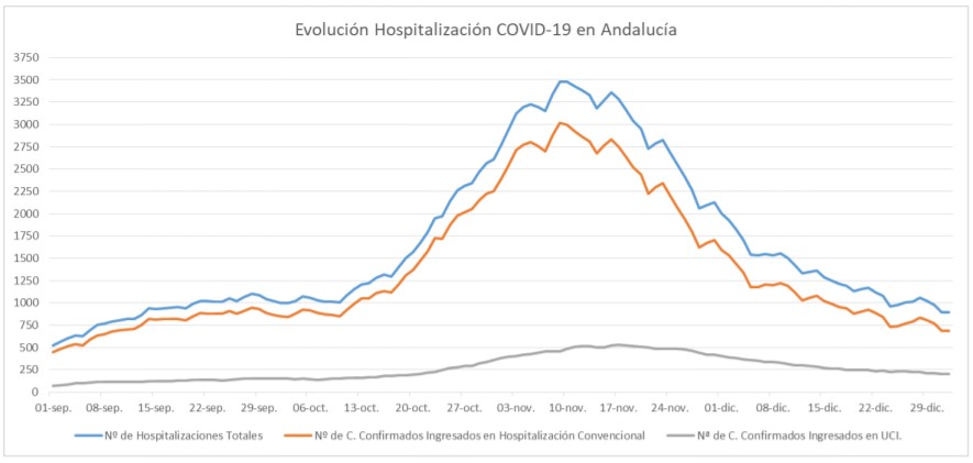La Consejería de Salud y Familias informa de que, actualmente, 893 pacientes confirmados con COVID-19 permanecen ingresados en los hospitales andaluces, de los que 206 se encuentran en UCI.