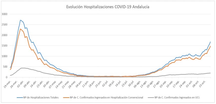 Por provincias: en Almería (58 hospitalizaciones, de los que 14 en UCI), Cádiz (171 hospitalizaciones, de los que 19 en UCI), Córdoba (155 hospitalizaciones, de los que 15 en UCI), Granada (360 hospitalizaciones, de los que 51 en UCI), Huelva (53 hospitalizaciones, de los que 5 en UCI), Jaén  (157 hospitalizaciones, de los que 19 en UCI), Málaga (203 hospitalizaciones, de los que 30 en UCI) y Sevilla (518 hospitalizaciones, de los que 48 en UCI).
