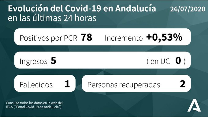 Por provincias: en Almería (14 hospitalizaciones de los que 2 en UCI), Cádiz (4 hospitalizaciones y ninguno en UCI), Córdoba (6 hospitalizaciones de los que 2 en UCI), Granada (9 hospitalizaciones y ninguno en UCI), Huelva (1 hospitalizaciones y ninguno en UCI), Jaén (2 hospitalizaciones y ninguno en UCI), Málaga (6 hospitalizaciones y ninguno en UCI) y Sevilla (3 hospitalizaciones de los que 1 en UCI).