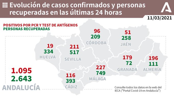 Por provincias: en Almería (139 hospitalizaciones, de las que 51 en UCI), Cádiz (142 hospitalizaciones, de las que 50 en UCI), Córdoba (120 hospitalizaciones, de las que 26 en UCI), Granada (258 hospitalizaciones, de las que 63 en UCI), Huelva (44 hospitalizaciones, de las que 6 en UCI), Jaén (111 hospitalizaciones, de las que 23 en UCI), Málaga (247 hospitalizaciones, de las que 38 en UCI) y Sevilla (200 hospitalizaciones, de las que 53 en UCI).