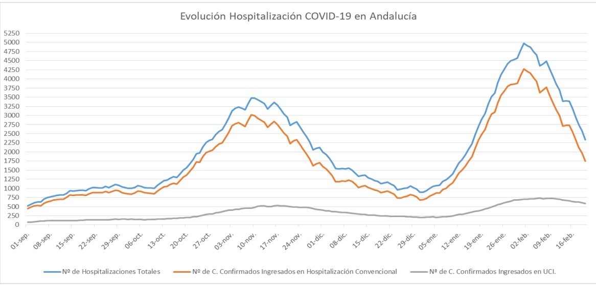 La Consejería de Salud y Familias informa de que, actualmente, 2.333 pacientes confirmados con COVID-19 permanecen ingresados en los hospitales andaluces, de los que 581 se encuentran en UCI.