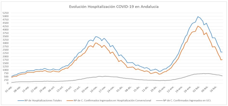 La Consejería de Salud y Familias informa de que, actualmente, 2.338 pacientes confirmados con COVID-19 permanecen ingresados en los hospitales andaluces, de los que 564 se encuentran en UCI.
