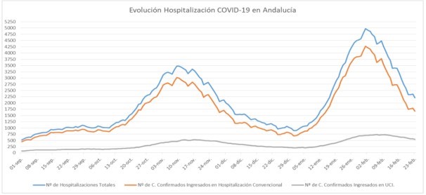 La Consejería de Salud y Familias informa de que, actualmente, 2.208 pacientes confirmados con COVID-19 permanecen ingresados en los hospitales andaluces, de los que 538 se encuentran en UCI.