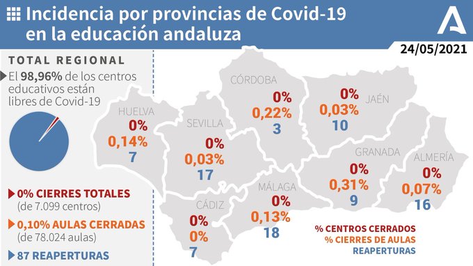 El 98,96% de los centros educativos andaluces están libres de coronavirus. Cierres totales o parciales y reaperturas a 24 de mayo: ningún cierre completo de centros (de 7.099 centros, un 0%), 82 aulas (de 78.024 aulas, un 0,10%) y 87 reaperturas.