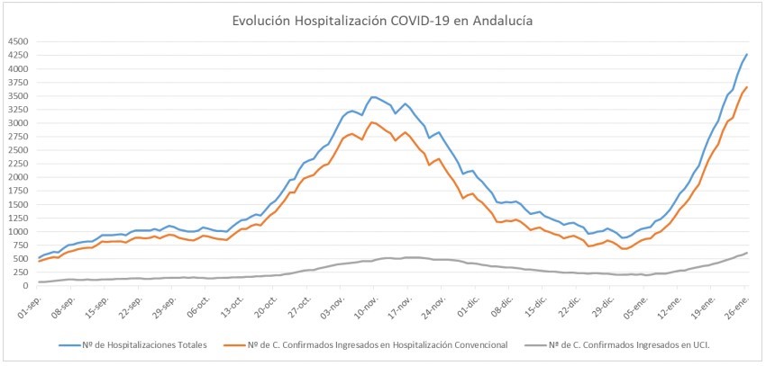 La Consejería de Salud y Familias informa de que, actualmente, 4.268 pacientes confirmados con COVID-19 permanecen ingresados en los hospitales andaluces, de los que 606 se encuentran en UCI.