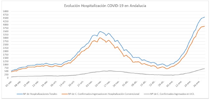 Por provincias: en Almería (420 hospitalizaciones, de las que 94 en UCI), Cádiz (859 hospitalizaciones, de las que 107 en UCI), Córdoba (406 hospitalizaciones, de las que 71 en UCI), Granada (593 hospitalizaciones, de las que 115 en UCI), Huelva (272 hospitalizaciones, de las que 33 en UCI), Jaén (308 hospitalizaciones, de las que 40 en UCI), Málaga (927 hospitalizaciones, de las que 113 en UCI) y Sevilla (784 hospitalizaciones, de las que 111 en UCI).