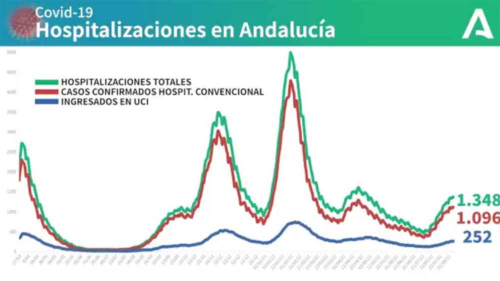La Consejería de Salud y Familias informa de que, actualmente, 1.348 pacientes confirmados con COVID-19 permanecen ingresados en los hospitales andaluces, de los que 252 se encuentran en UCI.