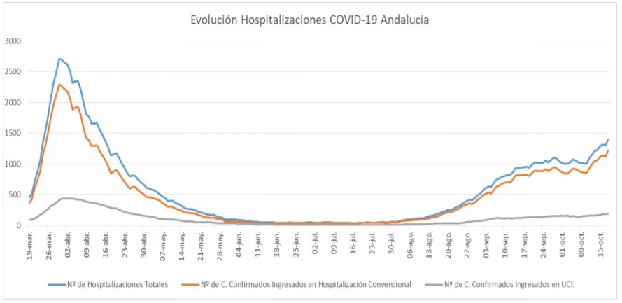 La Consejería de Salud y Familias informa de que, actualmente, 1.398 pacientes confirmados con COVID-19 permanecen ingresados en los hospitales andaluces, de los que 188 se encuentran en UCI.