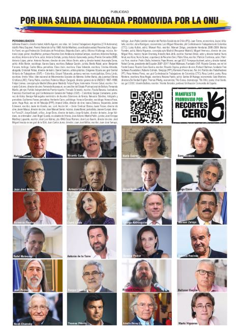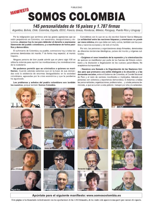 El manifiesto está promovido por Recortes Cero y puede leerse también y, con todos los firmantes, en www.somoscolombia.es.