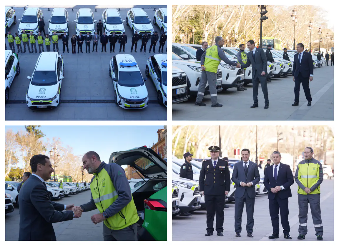 El presidente de la Junta de Andalucía, Juanma Moreno, acompañado por el consejero de la Presidencia, Antonio Sanz, ha presentado hoy en el Palacio de San Telmo los nuevos vehículos adquiridos para la Unidad de Policía Nacional Adscrita a la Junta de Andalucía (UPA) y Protección Civil.