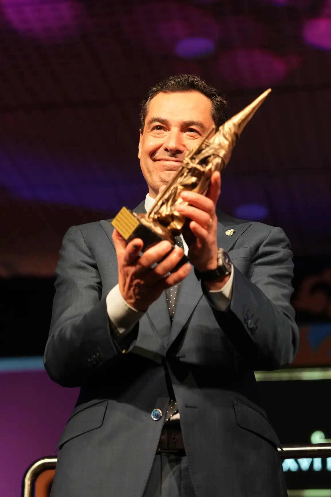 El presidente de la Junta de Andalucía, Juanma Moreno, participó anoche en los Premios Cofrades Ciudad de Marbella donde ha recibido el título de ‘Nazareno del Año de Honor’.