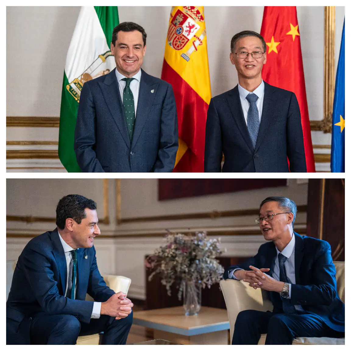 El presidente de la Junta de Andalucía, Juanma Moreno, ha recibido hoy en el Palacio de San Telmo al embajador de China en España, Yao Jing, con el objetivo de fortalecer las relaciones comerciales y empresariales entre ambos mercados.