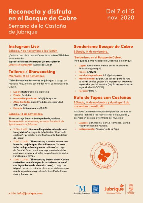 Además de la ruta de la tapa, entre las actividades que se han celebrado destacan los showcookings retransmitidos en directo a través de la página de Facebook de ‘Sabor a Málaga’ y del Ayuntamiento de Jubrique, y en los que ha participado Iván Sastre, propietario del restaurante Bandolero de Júzcar y conocido como el chef de las castañas; Samuel Perea, director de gastronomía de La Fundación el Pimpi o Miguel Herrera, cocinero y fundador de Rustic Experience, quienes han elaborado platos y recetas con la castaña como ingrediente protagonista.