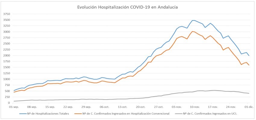 La Consejería de Salud y Familias informa de que, actualmente, 1.998 pacientes confirmados con COVID-19 permanecen ingresados en los hospitales andaluces, de los que 404 se encuentran en UCI.