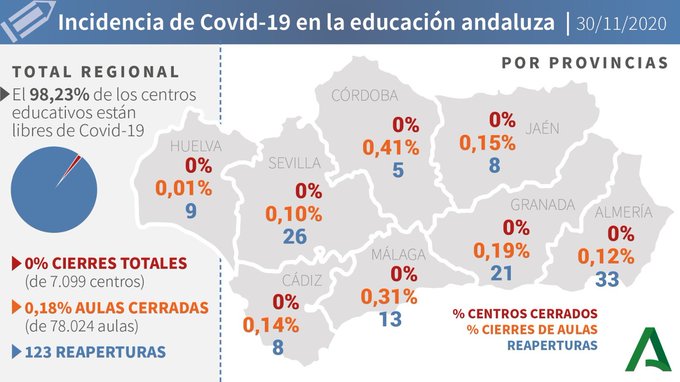 El 98,23% de los centros educativos andaluces están libres de coronavirus. Cierres totales o parciales y reaperturas a 30 de noviembre: ningún cierre completo (de 7.099 centros, un 0%). 148 aulas (de 78.024 aulas, un 0,18%). 123 reaperturas.
