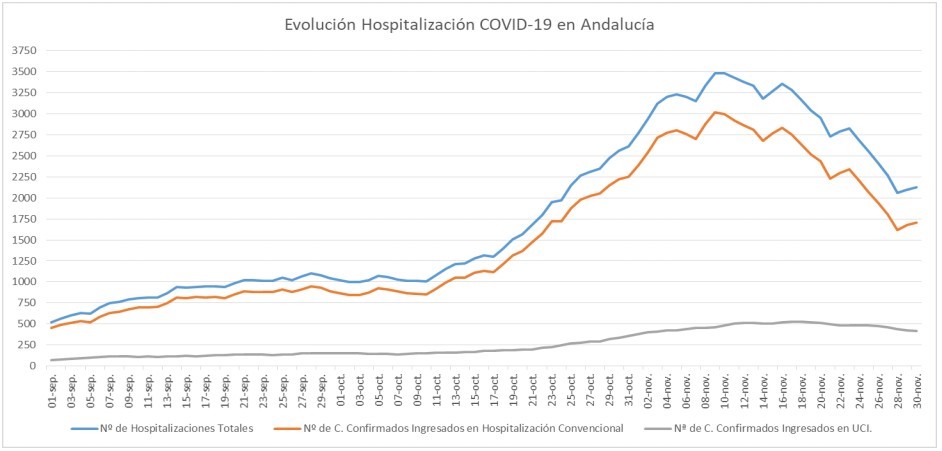 Por provincias: en Almería (134 hospitalizaciones, de las que 41 en UCI), Cádiz (314 hospitalizaciones, de las que 55 en UCI), Córdoba (198 hospitalizaciones, de las que 33 en UCI), Granada (474 hospitalizaciones, de las que 105 en UCI), Huelva (120 hospitalizaciones, de las que 18 en UCI), Jaén (239 hospitalizaciones, de las que 38 en UCI), Málaga (320 hospitalizaciones, de las que 38 en UCI) y Sevilla (325 hospitalizaciones, de las que 91 en UCI).