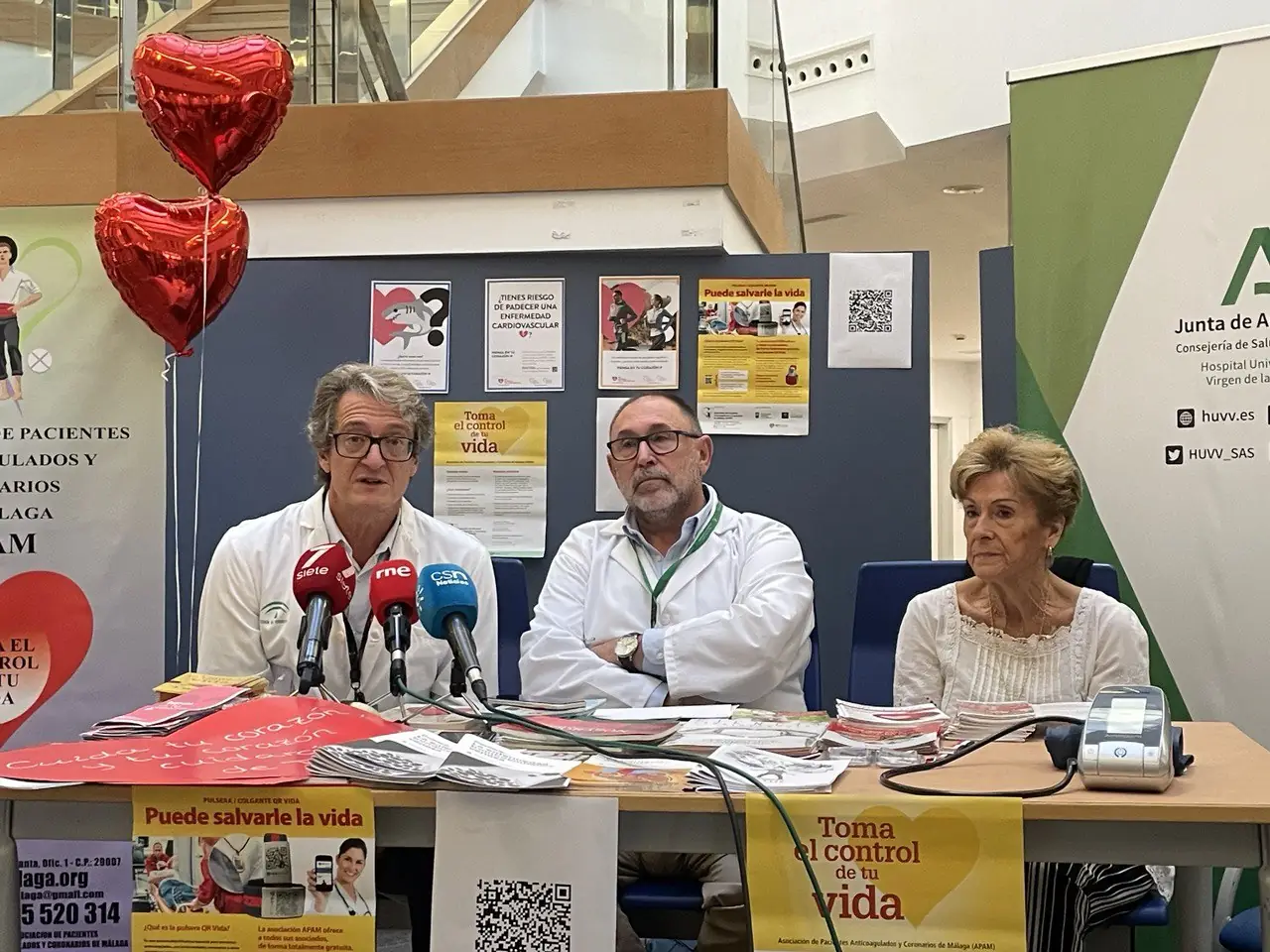 Por otro lado, esta mañana ha tenido lugar el acto central de la semana del Corazón, con una mesa participativa e informativa, organizada por la unidad de Corazón en coordinación con los voluntarios y representantes de APAM, donde se ha medido la tensión arterial a los usuarios de consultas externas del patio azul, y se han impartido recomendaciones para una vida saludable en relación a las enfermedades cardiovasculares. Al acto ha asistido el director gerente del centro, Jesús Fernández Galán, y el director del plan de atención a las Cardiopatías de Andalucía, y responsable de la unidad de Corazón del hospital, Juan José Gómez Doblas.