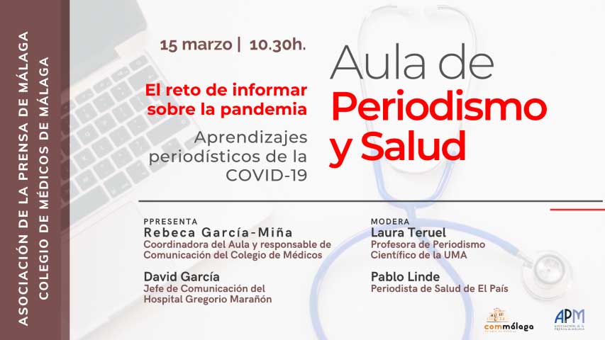 La Asociación de la Prensa de Málaga (APM) y el Colegio de Médicos de Málaga retoman su ciclo de encuentros ‘Aula de Periodismo y Salud’ con una mesa redonda en la que periodistas expertos en comunicación sanitaria analizarán el reto informativo que ha supuesto enfrentarse a la pandemia. El encuentro se ofrecerá en abierto a través del canal de YouTube del Colegio de Médicos de Málaga el próximo 15 de marzo, a las 10.30 horas, bajo el título ‘El reto de informar sobre la pandemia. Aprendizajes periodísticos de la COVID-19’.