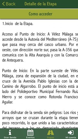 Por ello, la aplicación cuenta con información relativa a la historia y características generales de la Gran Senda y una relación de cada una de las 35 etapas totalmente detalladas, en las que se incluye el perfil del trazado, imágenes, las indicaciones de cómo acceder, descripción exhaustiva del itinerario desde el punto de vista histórico y medio ambiental y un apartado de desarrollo personal en el que se invita a los senderistas a conectar cuerpo y mente con el medio ambiente.