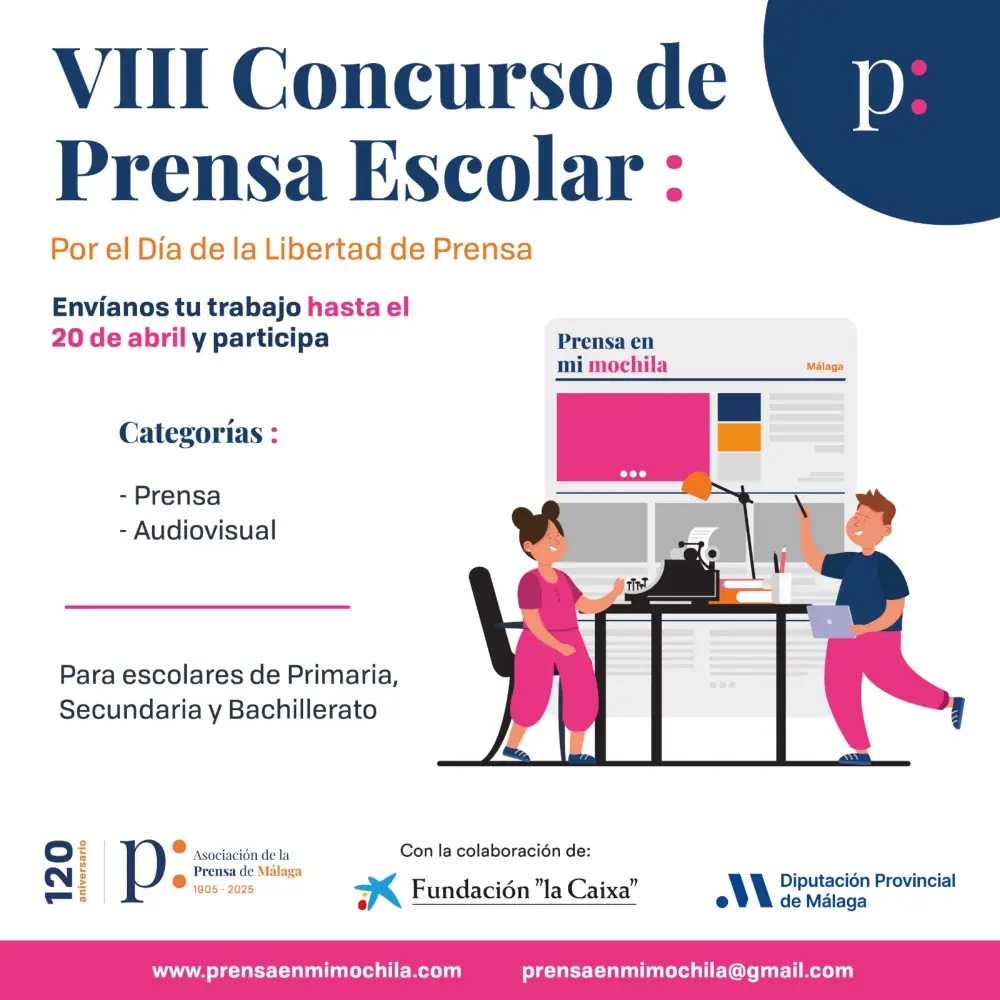 La Asociación de la Prensa de Málaga (APM) y la Diputación Provincial convocan a la VIII edición del Concurso de Prensa Escolar, con el que invitan a los jóvenes reporteros a redactar sus noticias, entrevistas y reportajes y a presentar sus vídeos y podcast de tono informativo para demostrar su buena redacción o sus dotes periodísticas frente al micrófono o la cámara.