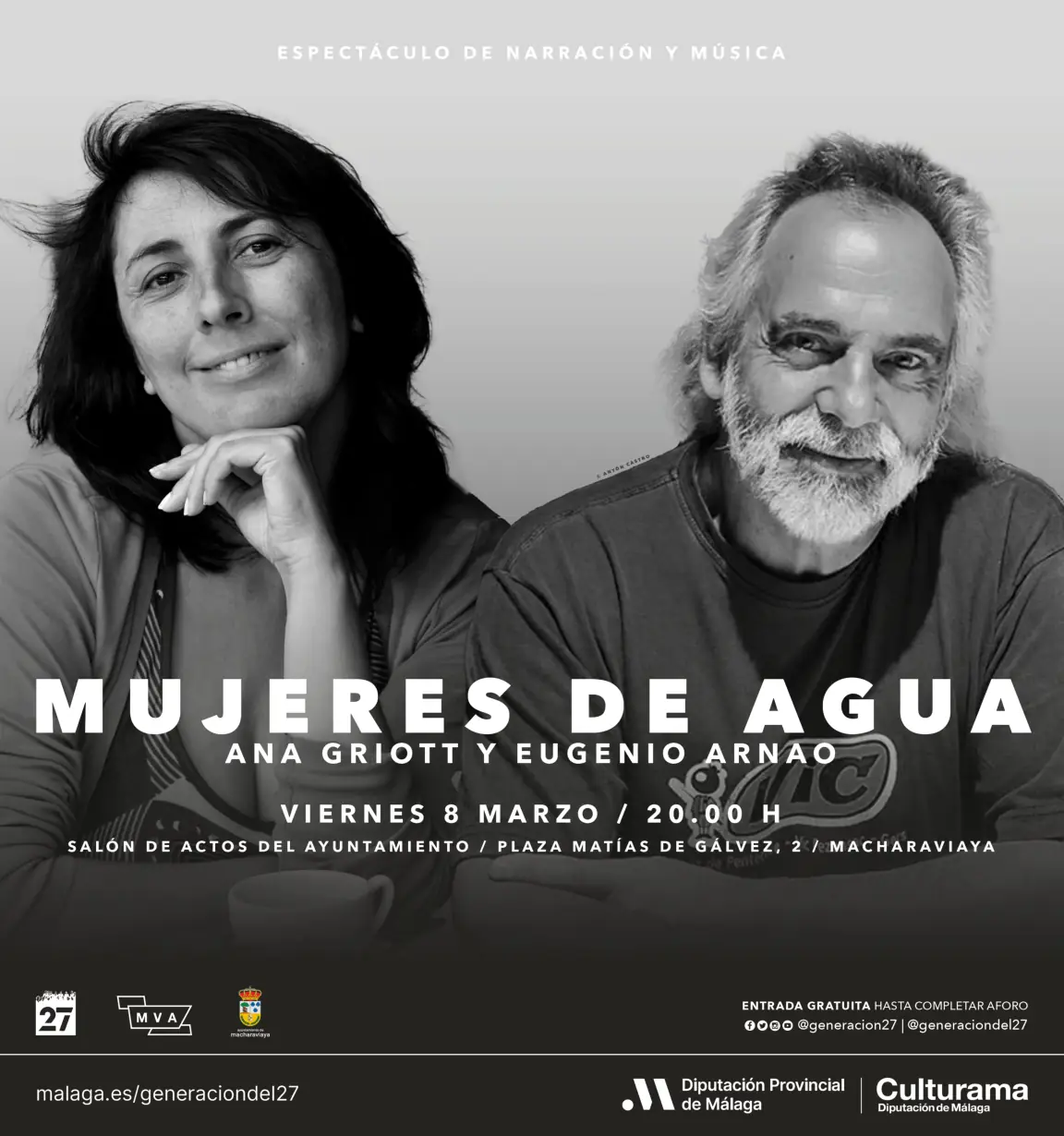 Asimismo, el Centro Generación del 27, presenta la actividad ‘Mujeres de agua, un paseo por los cauces mágicos’, un espectáculo de narración oral y musical, con Anna Griott y Eugenio Arnao. Será el 7 de marzo a las 18:30 horas en Algarrobo (salón de Plenos del Ayuntamiento, Antonio Ruiz Rivas, 2) y 8 de marzo a las 20:00 en Macharaviaya (salón de actos del Ayuntamiento, plaza Matías de Gálvez, 2). Entrada libre hasta completar aforo.