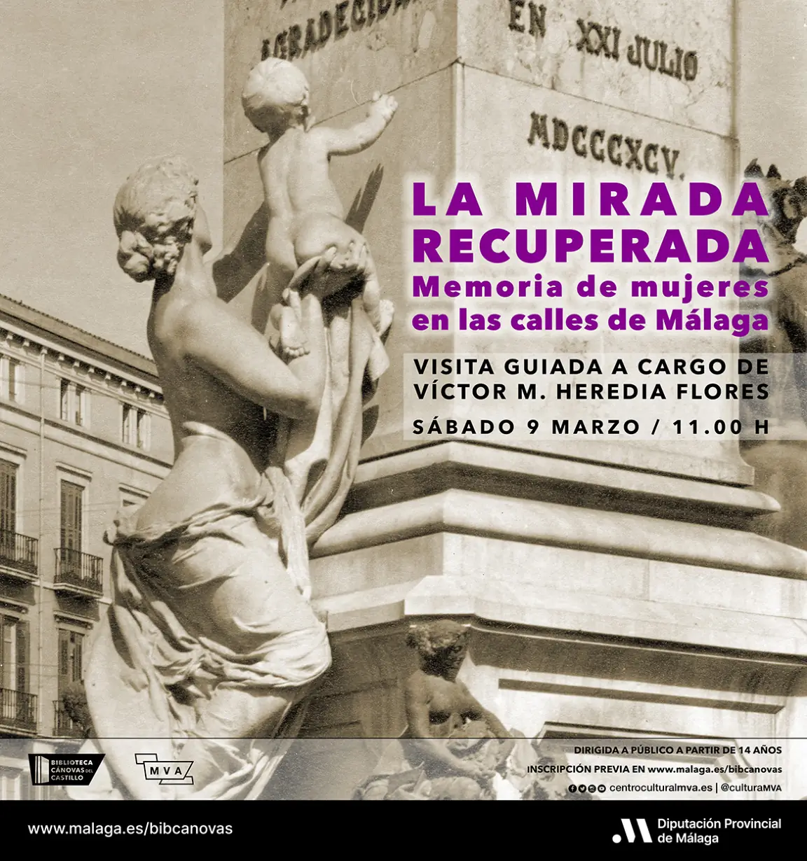 La Biblioteca Cánovas del Castillo ha organizado para el sábado 9 de marzo, a las 10:45 horas, una visita guiada por el centro urbano de Málaga para conocer la historia de las mujeres a través de su huella en la ciudad bajo el título Málaga Eterna – La mirada recuperada. Memoria de mujeres en las calles de Málaga.