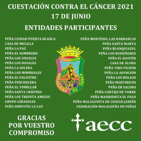 Ante la petición de la Asociación Española Contra el Cáncer a las entidades que conforman la Federación Malagueña de Peñas para que participen en su tradicional Cuestación que tendrá lugar el próximo jueves 17 de junio, nos complace comunicar que la respuesta ha sido muy importante.