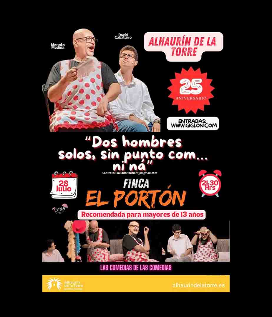 Los actores Manolo Medina y David Caballero son los protagonistas de la que es la comedia decana de los escenarios en España. ‘Dos hombre solos sin punto com ni ná’ está de gira por su 25 aniversario y hará parada también en Alhaurín este próximo domingo, 28 de julio, dentro del programa Estivalh, la marca que agrupa la agenda de espectáculos del verano en la Finca El Portón.