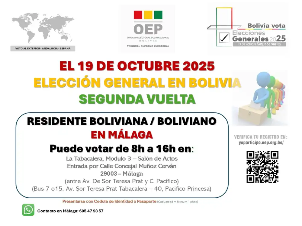 El Órgano Electoral Plurinacional (OEP) ha hecho un llamado a la comunidad boliviana residente en Andalucía para que participe activamente en esta jornada cívica y ejerza su derecho al voto.