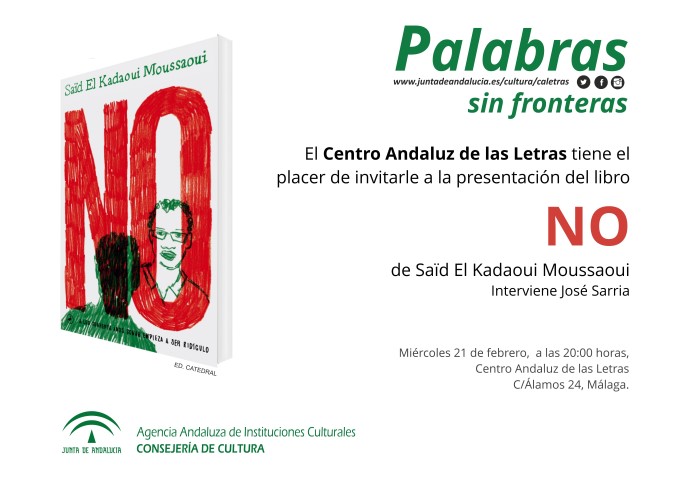 La Consejería de Cultura, a través del Centro Andaluz de las Letras (CAL), prosigue celebrando el ciclo literario ‘Palabras sin fronteras’ con la presentación del libro ‘No’ del escritor Saïd El Kadaoui Moussaoui. La cita literaria, que tendrá lugar mañana día 21 a las 20:00 horas en la sede del CAL, contará con la presencia de José Sarria.