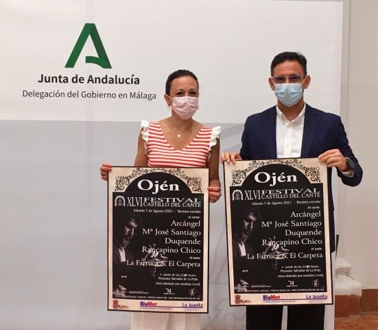 La delegada del Gobierno andaluz en Málaga, Patricia Navarro, y el alcalde de Ojén, José Antonio Gómez, han presentado este jueves la 46ª edición del Festival Castillo del Cante de Ojén en la sede de la Junta de Andalucía de la provincia y han destacado “la veteranía y juventud, experiencia y arrojo” del cartel, en el que figuran Arcángel, María José Santiago, Duquende y Rancapino Chico con La Farruca y El Carpeta al baile.