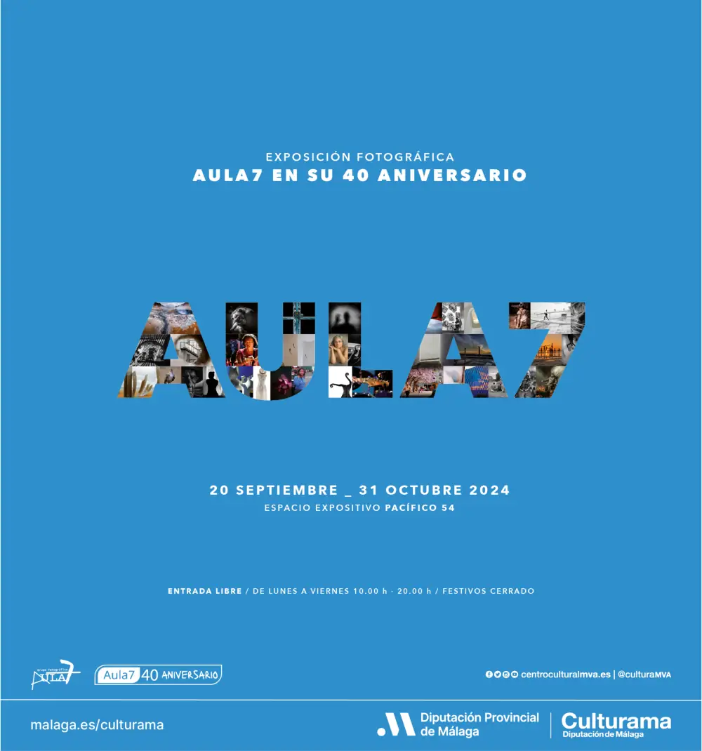 El espacio expositivo Pacífico 54 de la Diputación acoge una muestra de los trabajos del grupo fotográfico malagueño Aula7 con motivo de su 40º aniversario. La exposición, que se puede visitar hasta el 31 de octubre, incluye los trabajos de 36 fotógrafos realizados con diversas técnicas, estilos y motivos, desde el color al blanco y negro, de la fotografía de calle a la imaginativa, creativa, de naturaleza, paisaje, documental o retrato.