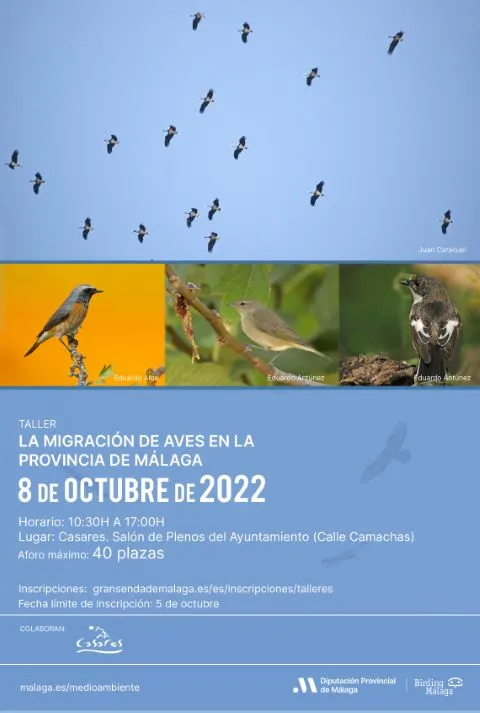 La Diputación de Málaga, a través de su programa Birding Málaga, celebra el Día Mundial de las Aves Migratorias -que se conmemora este sábado, 8 de octubre- con un taller dedicado a ‘La migración de aves en la provincia de Málaga’, que se celebrará en Casares, en colaboración con el Ayuntamiento del municipio.