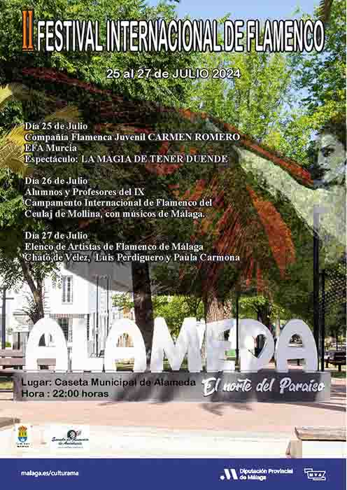 La programación del II Festival Internacional de Flamenco de Alameda tendrá lugar en la caseta municipal a partir de las 22:00 horas. El jueves 25 de julio actuará la compañía flamenca juvenil de Carmen Romero con el espectáculo ‘La magia de tener duende’. El viernes 26 participarán alumnos y profesores del IX Campamento Internacional de Flamenco y Danza con músicos de Málaga. Y el sábado 27 de julio concluirá esta triple jornada con los cantaores Chato de Vélez y Luis Perdiguero y la joven bailaora Paula Carmona con su cuadro flamenco.