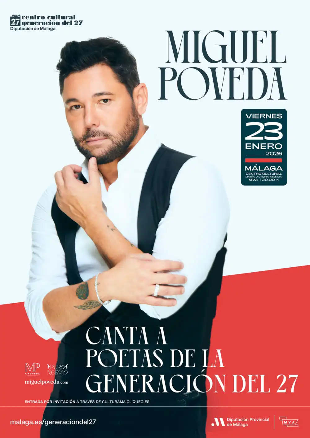 La Diputación de Málaga inicia los actos conmemorativos del centenario de la Generación del 27 con la actuación estelar de Miguel Poveda, que tendrá lugar este viernes 23 de enero en el centro cultural María Victoria Atencia de calle Ollerías a partir de las 20.00 horas. Las entradas gratuitas se pueden obtener a partir de esta misma tarde a partir de las 17.00 horas en culturama.cliqueo.es .