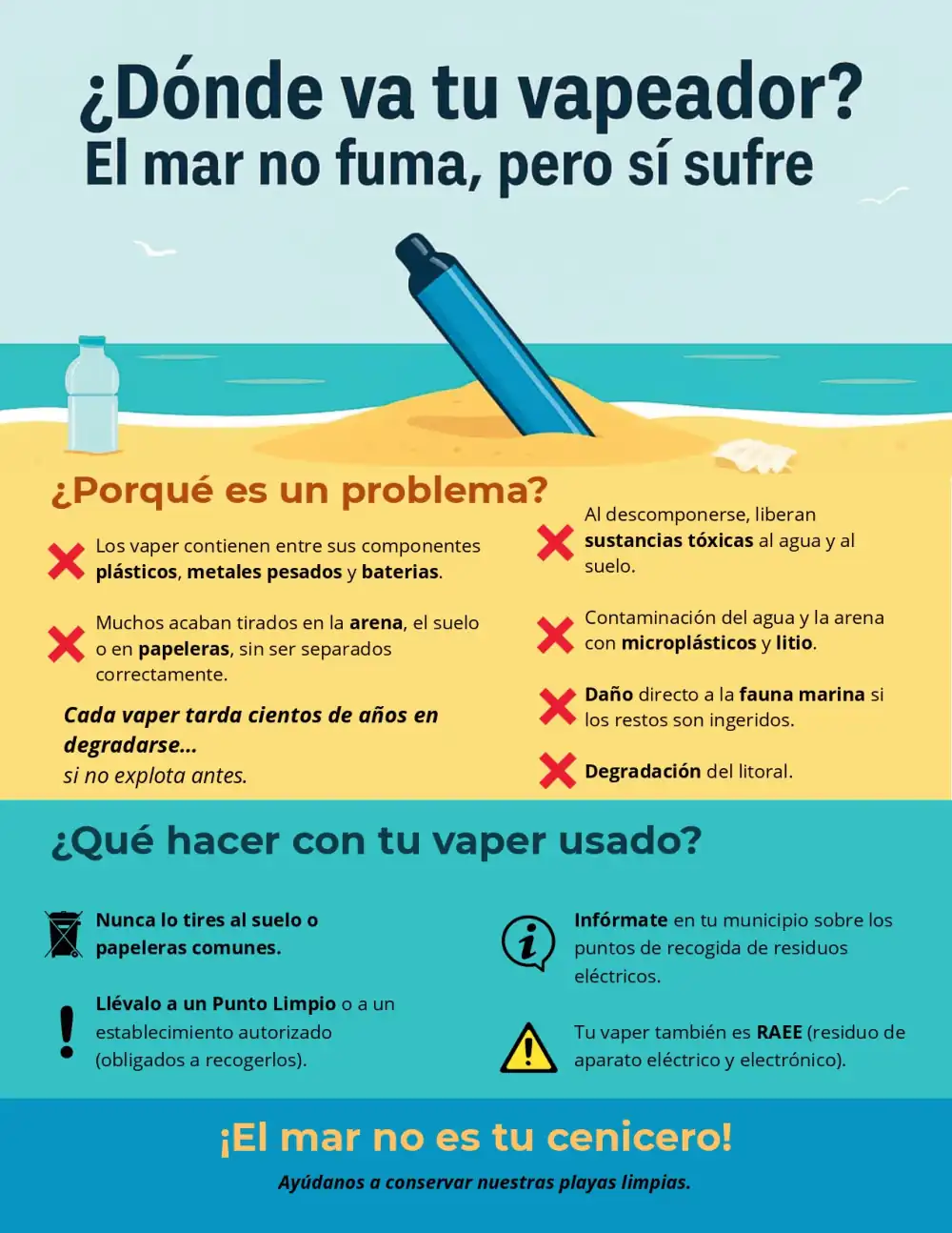 Rodríguez subrayó la necesidad de abordar el problema de los vapeadores, compuestos por plásticos, metales pesados y baterías que, si no se desechan en puntos limpios o establecimientos autorizados, pueden liberar sustancias tóxicas y contaminar suelos y aguas. El mensaje es claro: estos dispositivos no deben tirarse a papeleras comunes ni abandonarse en el entorno natural.