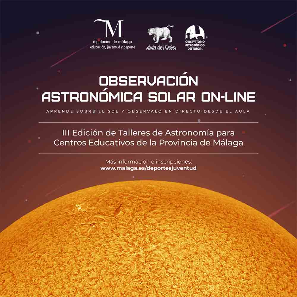 La tercera edición de los talleres de Astronomía, que pone en marcha el Servicio de Educación de la Diputación de Málaga, está compuesta por 80 talleres online y gratuitos de los que se beneficiarán hasta 2.500 alumnos de Primaria, Secundaria, Bachillerato y Formación Profesional de la provincia. En todos los talleres y bajo el título ‘Cómo ver arder el Sol’, los alumnos observarán en directo el sol y la intensa actividad que se desarrolla en sus diferentes capas, concretamente en la fotosfera y en la cromosfera.