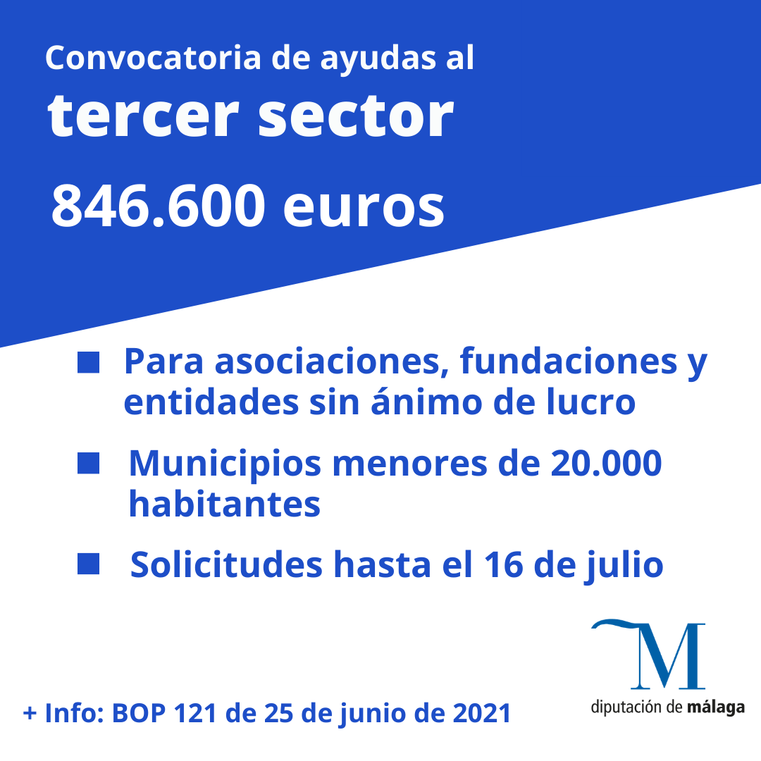 El Boletín Oficial de la Provincia ha publicado, con fecha 25 de junio, la convocatoria, en régimen de concurrencia competitiva, para la concesión de ayudas económicas a entidades del tercer sector para la ejecución de proyectos de atención a la ciudadanía en la provincia de Málaga 2021 con una dotación económica de 846.600 euros. El plazo para presentar solicitudes estará vigente hasta el 16 de julio, inclusive.