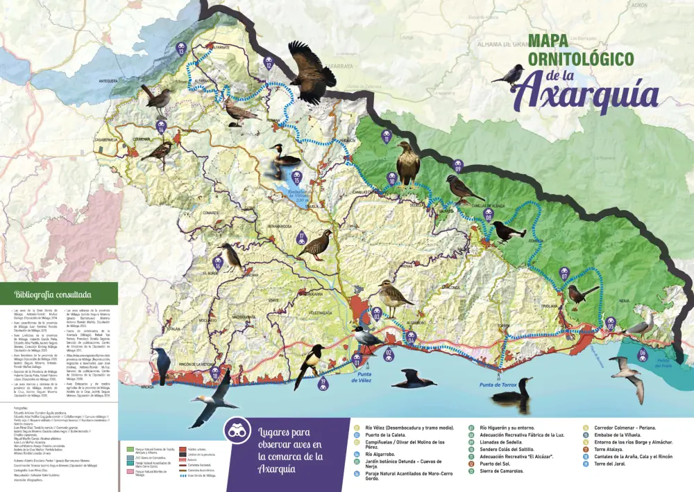 Sobre el Mapa ornitológico de la Axarquía, Ortega ha explicado que se trata de un material didáctico que recoge las especies de aves y los enclaves más relevantes para observarlas en la comarca oriental de la provincia. En el territorio axárquico se han seleccionado 19 enclaves de interés para la observación de aves en los distintos ambientes y ecosistemas.
