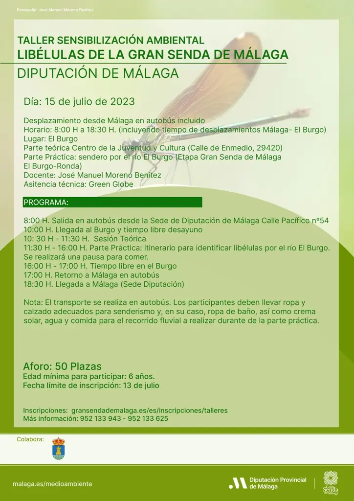 La Diputació n de M álaga celebrará el sábado 15 de julio, en El Burgo, un taller ambiental sobre iniciación a las libélulas en la provincia. Esta actividad forma parte del programa de actividades que la institución provincial realiza para divulgar el patrimonio natural de la Gran Senda de Málaga.
