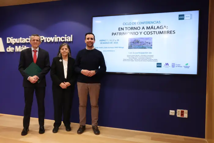 Así lo ha anunciado el diputado de Educación, Juventud y Mayores, José Santaolalla, junto a Luis Grau, director de la UNED Málaga, y María Dolores Rasero, en representación de la Asociación Pro Tradiciones Malagueñas ‘La Coracha’, en la presentación de este ciclo de conferencias que se realizarán durante el mes de marzo.