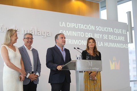 La Diputación de Málaga ha puesto en marcha el expediente para posibilitar que el Caminito del Rey sea declarado Patrimonio de la Humanidad. Así lo ha anunciado hoy el presidente de la Diputación de Málaga, Elías Bendodo, junto a los tres vicepresidentes de la institución, Francisco Salado, Ana Mata y María Francisca Caracuel y la diputada de Medio Ambiente y Promoción del Territorio, Marina Bravo.