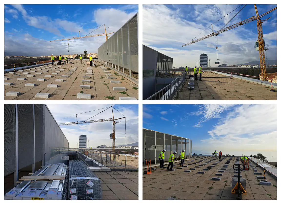 Las obras incluyen el montaje de estructuras soporte para los módulos fotovoltaicos en disposición coplanar mediante contrapesos rectangulares prefabricados y perfiles de anclaje, de tal manera que los paneles queden a ras de suelo, no aumentándose la altura del edificio y sin vistas desde la calle, ofreciendo así una integración arquitectónica.