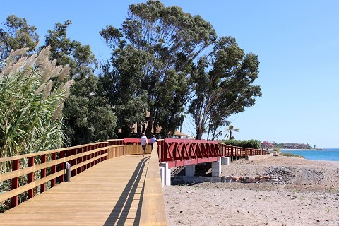 De este modo, los primeros 200 metros al oeste conecta (desde el paseo ya existente) la urbanización Hacienda Beach hasta el Arroyo de las Cañas mediante un tramo de hormigón color albero que cuenta con una zona ajardinada dotada de arbustos y árboles resistentes al medio marino, iluminación, bancos y papeleras. A continuación, una pasarela de madera de 110 metros une dicho paseo con la urbanización La Chimenea (Granados Playa), con un puente integrado de 30 metros de longitud sobre Arroyo de las Cañas. En su instalación se ha respetado el espacio dunar.