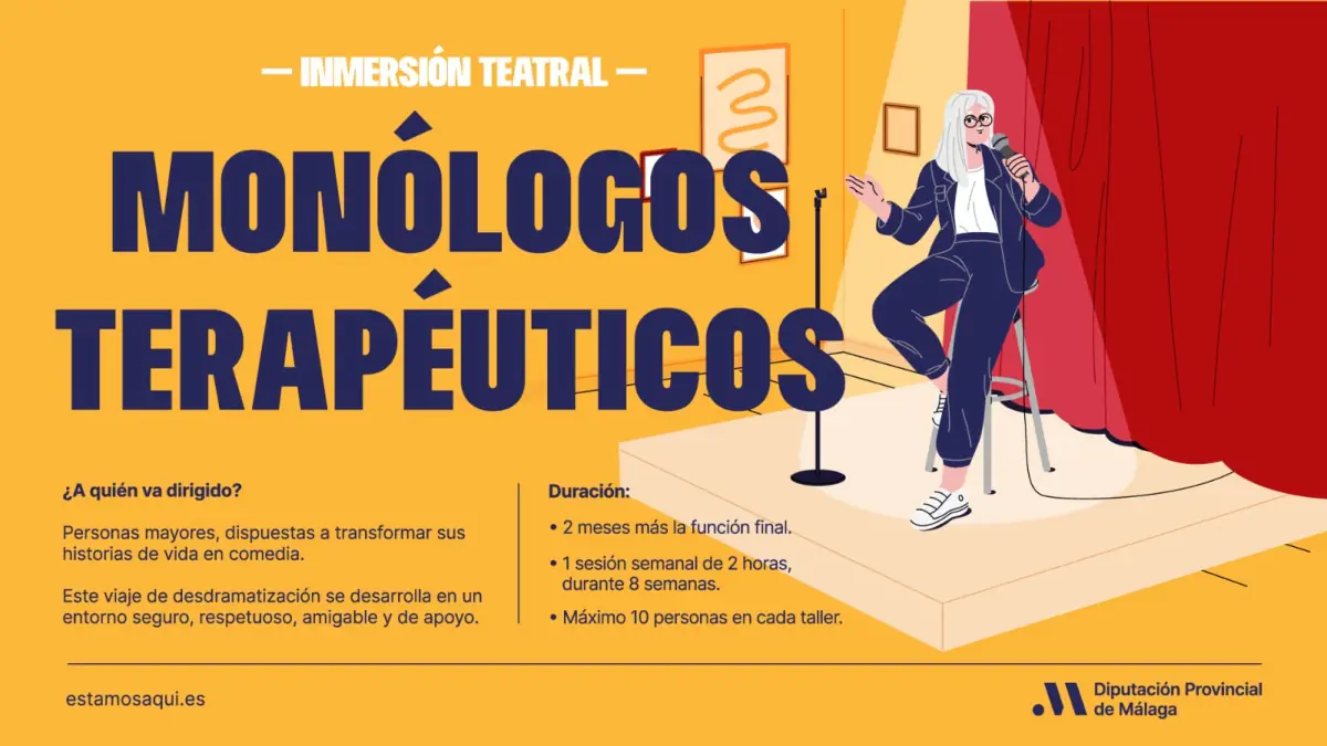 La Diputación de Málaga organiza talleres de monólogos terapéuticos para personas mayores, una inmersión en el mundo del teatro para quienes deseen narrar su historia personal, compartir relatos de sus vidas, recuerdos, experiencias, sueños y miedos, y desdramatizar determinadas situaciones transformándolas en comedia. Se celebrarán del 3 de septiembre al 10 de noviembre en Benarrabá, Yunquera, Benamargosa y Villanueva del Rosario con un total de 40 participantes de toda la provincia.
