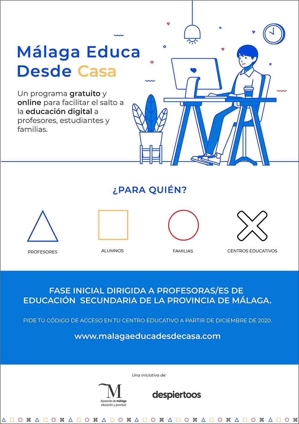 La Diputación de Málaga ha presentado hoy ‘Málaga Educa Desde Casa’, un programa pionero, gratuito y online para facilitar el salto a la educación digital a profesores, estudiantes y familias. La primera fase dirigida al profesorado ya está disponible en www.malagaeducadesdecasa.com . Una iniciativa del Servicio de Educación que cuenta con la colaboración de la empresa malagueña Despiertoos como desarrolladores.