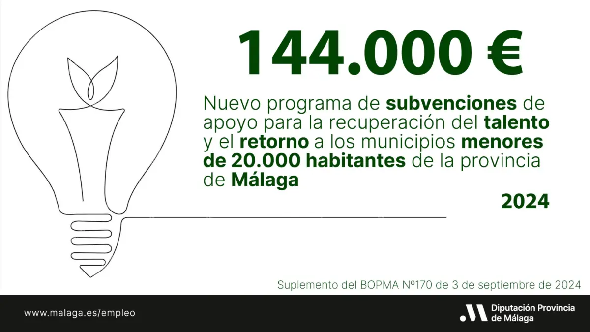 La Diputación de Málaga pone en marcha una nueva convocatoria de ayudas dirigida a autónomos, emprendedores, profesionales y empresas para fomentar el retorno o la vuelta de su actividad a municipios menores de 20.000 habitantes de la provincia. La dotación total es de 144.000 euros y la cuantía de las ayudas oscila entre los 9.000 y los 15.000 euros.