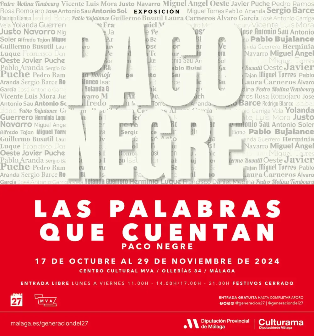 El martes 22 de octubre, a las 18.00 horas, el artista Paco Negre realizará una visita guiada, de hasta 20 personas, por su exposición ‘las palabras que cuentan’ ubicada en el Centro Cultural MVA (C/ Ollerías, 34). La exposición está formada por una colección de retratos realizados por Negre, quien ha captado con su cámara a 23 narradores naturales de Málaga o afincados en ella en el entorno en el que escriben. La muestra estará abierta al público hasta el 29 de noviembre con entrada gratuita.