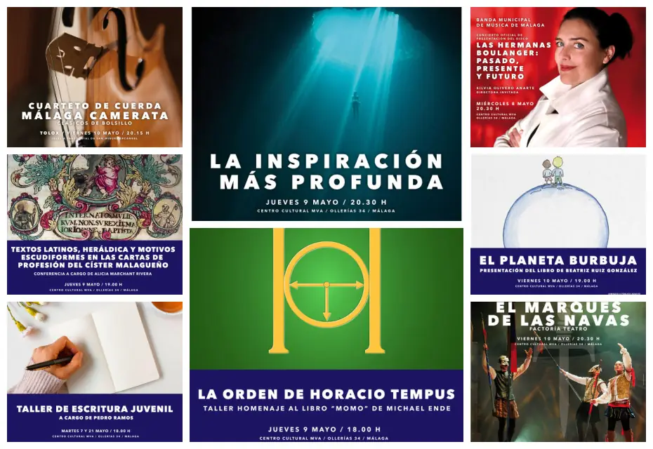El miércoles 8 de mayo se celebrará en el MVA el concierto de presentación del disco ‘Las hermanas Boulanger: pasado, presente y futuro’. El 9 de mayo se proyectará en el MVA el documental sobre apnea ‘La inspiración más profunda’, y en la Biblioteca Cánovas se celebrará una nueva cita del ciclo ‘Málaga Eterna’ sobre la historia de Málaga. Y el viernes 10, la cita será triple con la representación del ‘El Marqués de las Navas’, obra inédita de Lope de Vega, en el MVA; la presentación en la Biblioteca Cánovas del libro ‘El planeta Burbuja’, y la primera cita del ciclo de música clásica ‘Clásicos de bolsillo’ en Tolox.