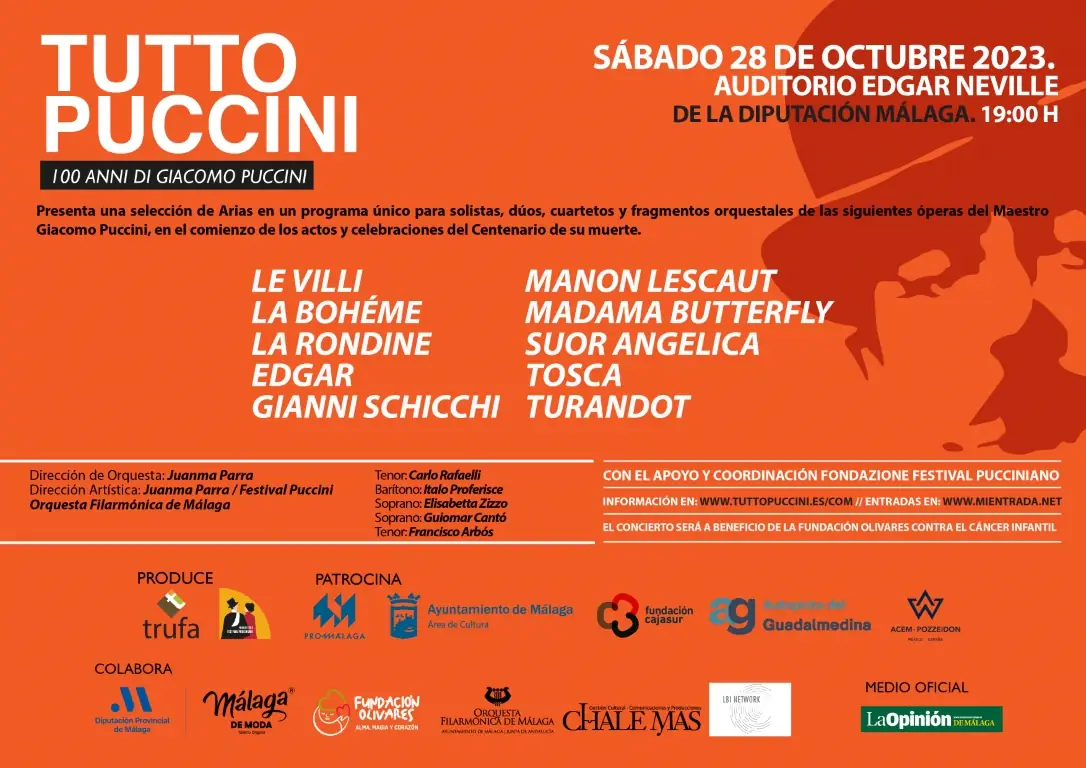 En noviembre de 1924 muere en Bruselas el gran maestro de ópera italiana Giacomo Puccini, convirtiéndose en figura universal de la historia de la ópera. Este concierto, a las puertas del 2024, es un homenaje al compositor con motivo del centenario de su muerte, organizado en colaboración con el Festival oficial Puccini de Torre del Lago (Italia), siendo Málaga la primera ciudad en conmemorar dicha efeméride que copará las programaciones de orquestas y festivales de todo el mundo.